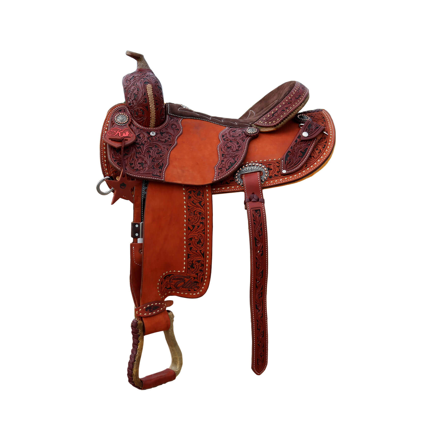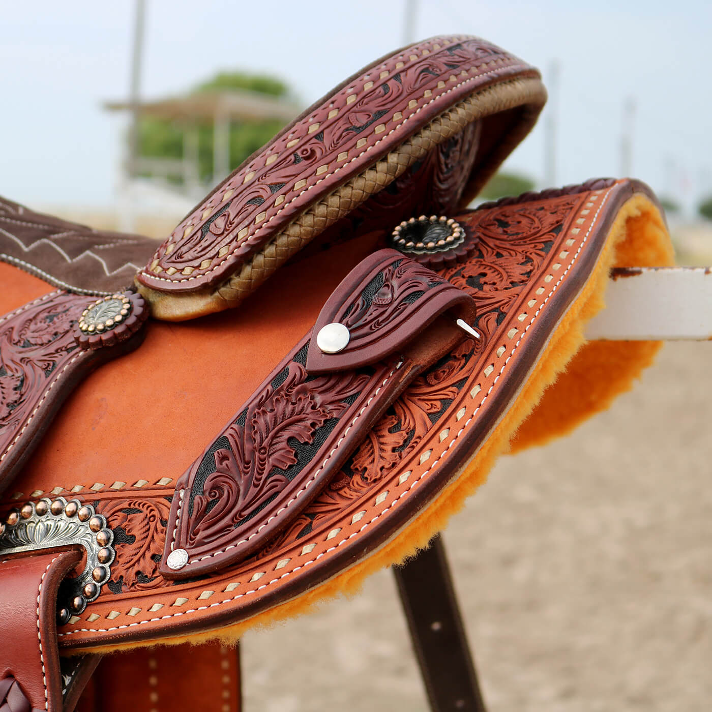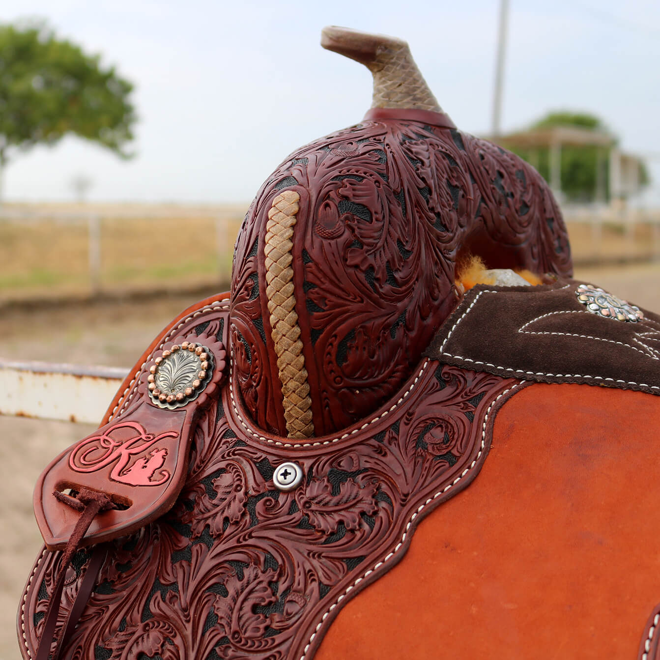 Brought to you by Kim Thomas. This (tree) design goes back to the 1980s and it is a modified BUSTER WELCH TREE with a FLATTER SEAT and LOWER CANTEL. The forward balance ride is designed to help you keep your feet straight or forward, eliminating any tipping forward. Also, the shorter horn is designed for the perfect hand fit and safety will allow you to adjust your position comfortably and securely. This saddle is all hand designed, tooled, and painted. With beautiful mini oak tooling and black hand-painted background paint. The seat is chocolate with hand-braided natural rawhide on the swell and the Cheyenne roll cantle. Natural buckstitch along the border of saddle and fenders. The skirt is round and comes with a hoof pick. The unique and gorgeous hand-tooled overlay on the side jockey as well, making this saddle beautiful on the inside and out. It comes with rawhide covered stirrup and the B4 concho set. Also includes matching hobble straps and flank! These saddles are for the competitive barrel racer, someone who is in it for the long haul! Also, written by Our Alamo Elite members! ONLY CHANGE REQUEST WE GET IS THAT CUSTOMERS WOULD LIKE A NORMAL 3.5IN” HORN, which is easy to do, please state so in the notes at checkout.
