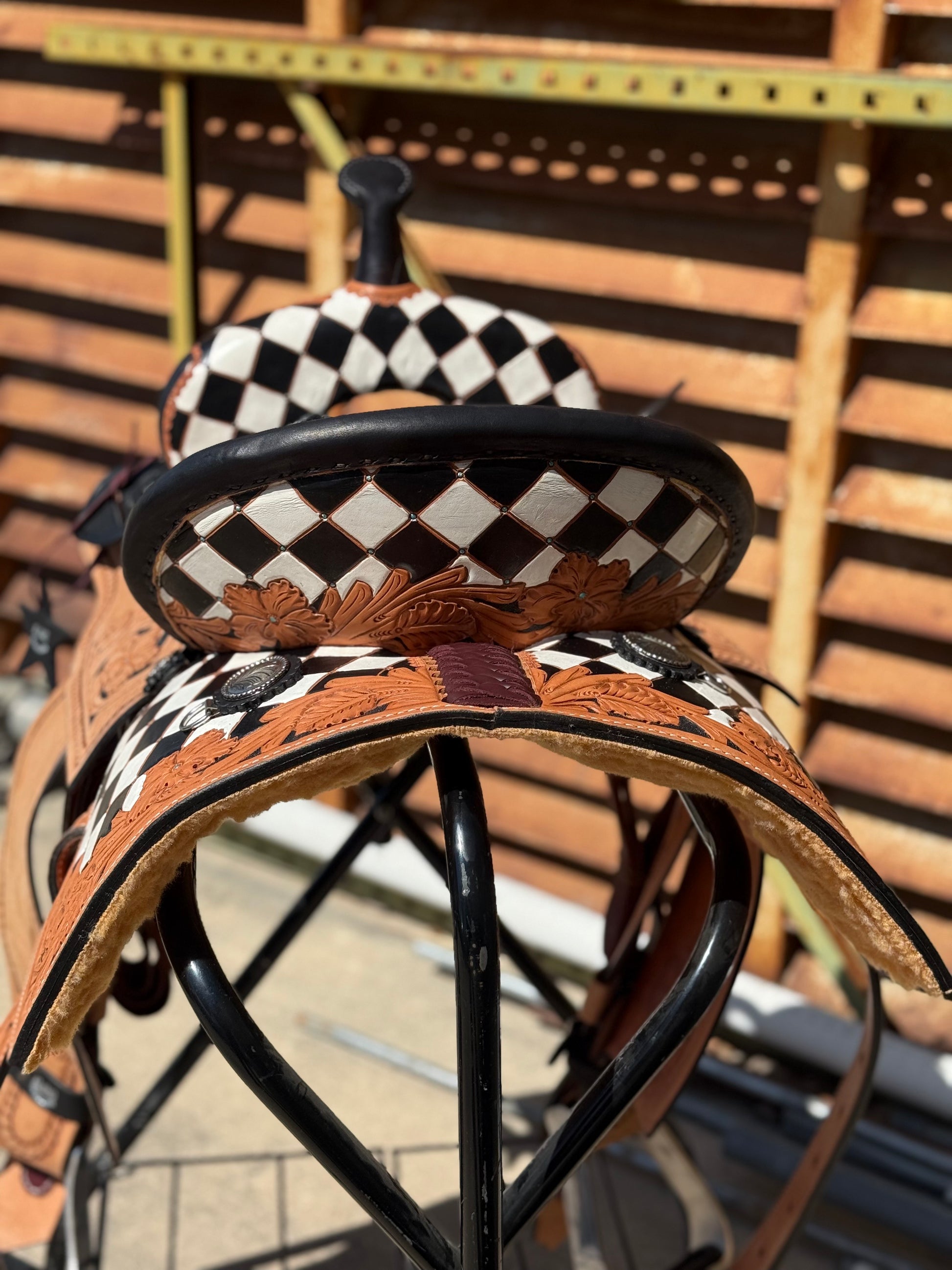 The Checkmate Cowgirl Barrel Saddle is a showstopper both in and out of the arena. Designed for speed, comfort, and undeniable style, this saddle combines premium craftsmanship with a bold black-and-white checkered design that turns heads everywhere it goes.