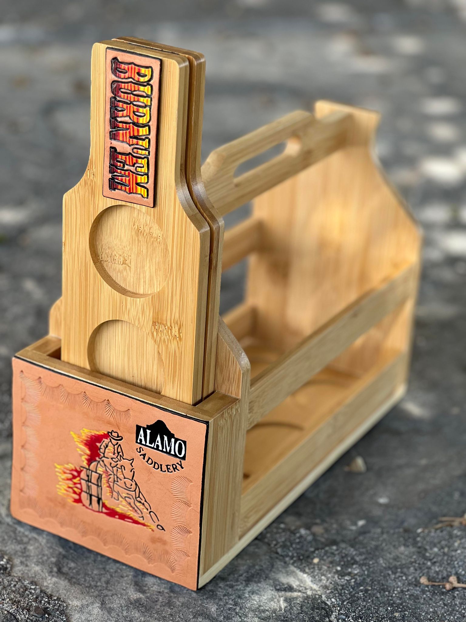 Drink holder with sampler boards. Holds 6 bottles of your choice, comes with 2 sampler paddles, a bottle opener and 6 slots for a variety of drinks.