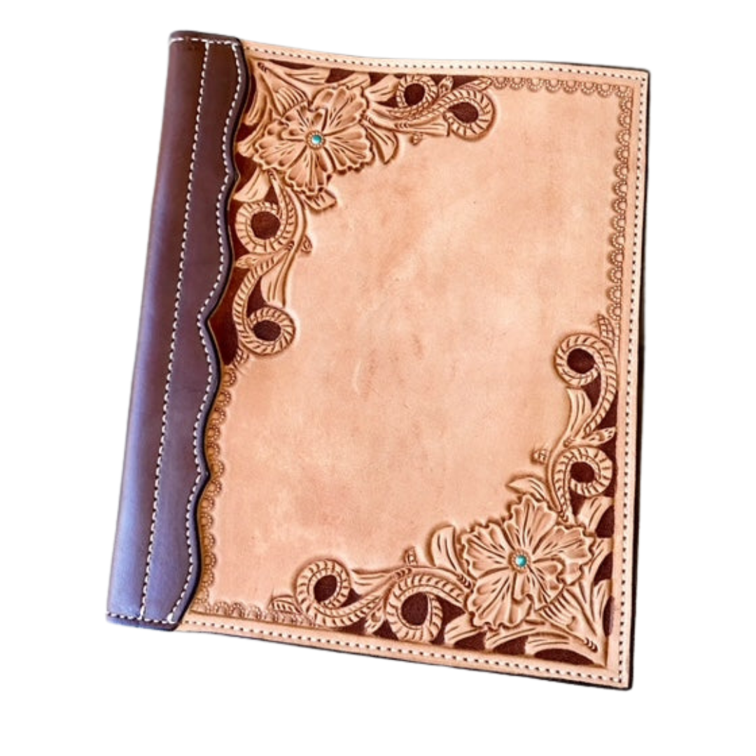 Large portfolio rough out golden and chocolate leather with floral corner tooling