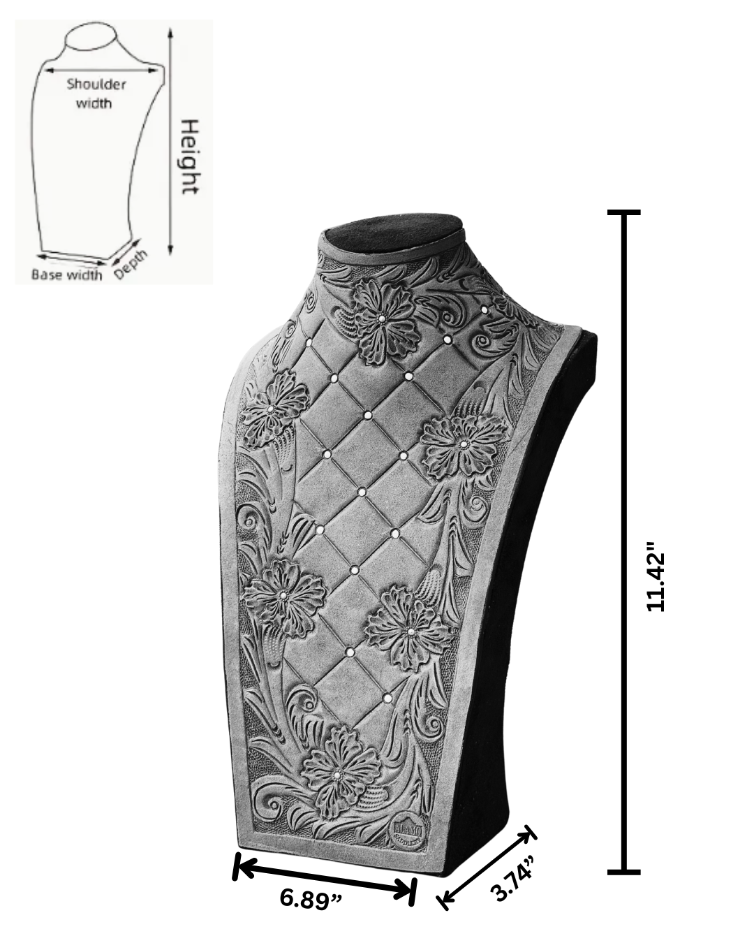 Make a statement with this hand-tooled leather necklace display stand, a true piece of western artistry. Every detail is carefully tooled by hand, showcasing intricate floral and scroll patterns that reflect timeless craftsmanship.
