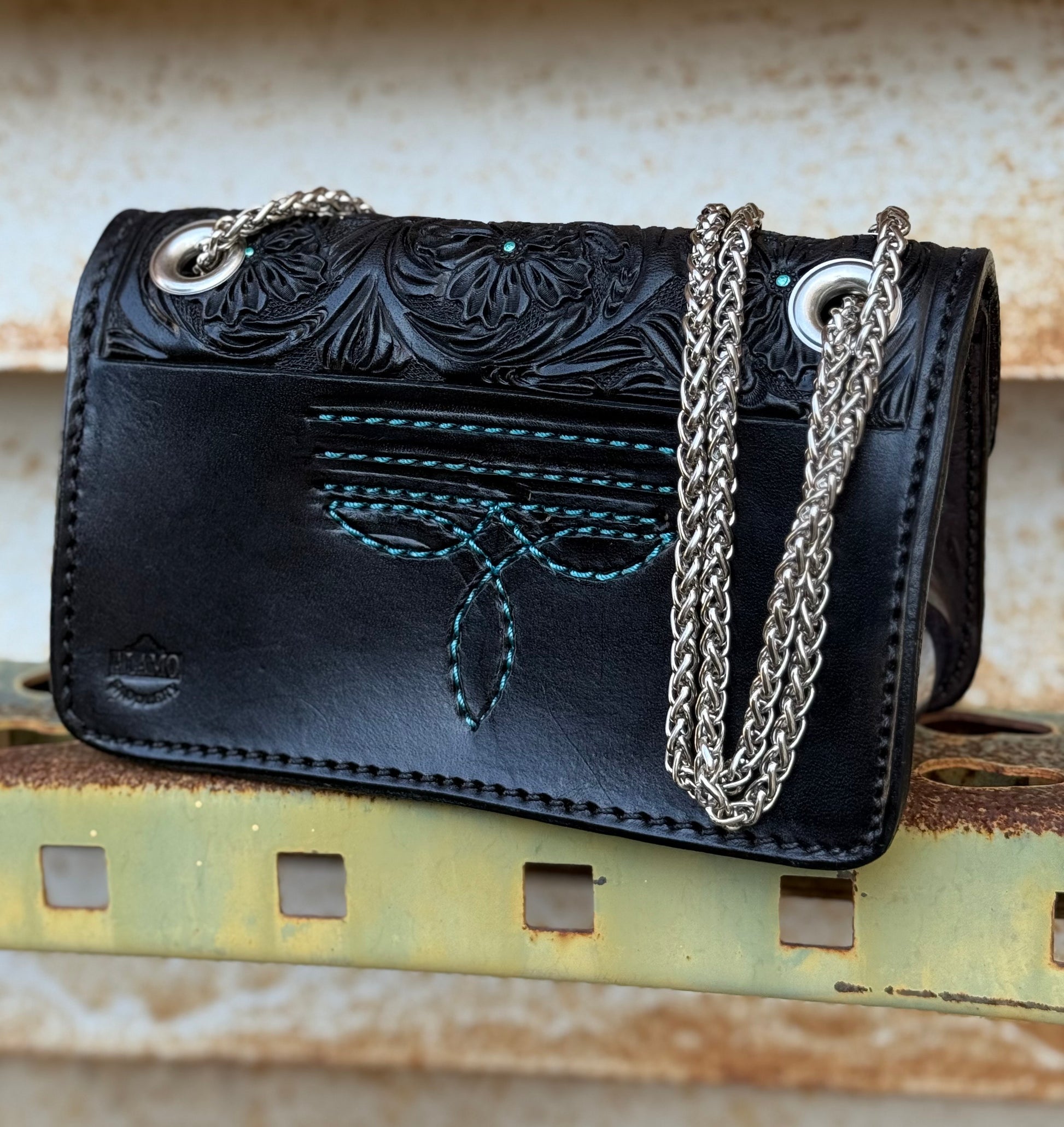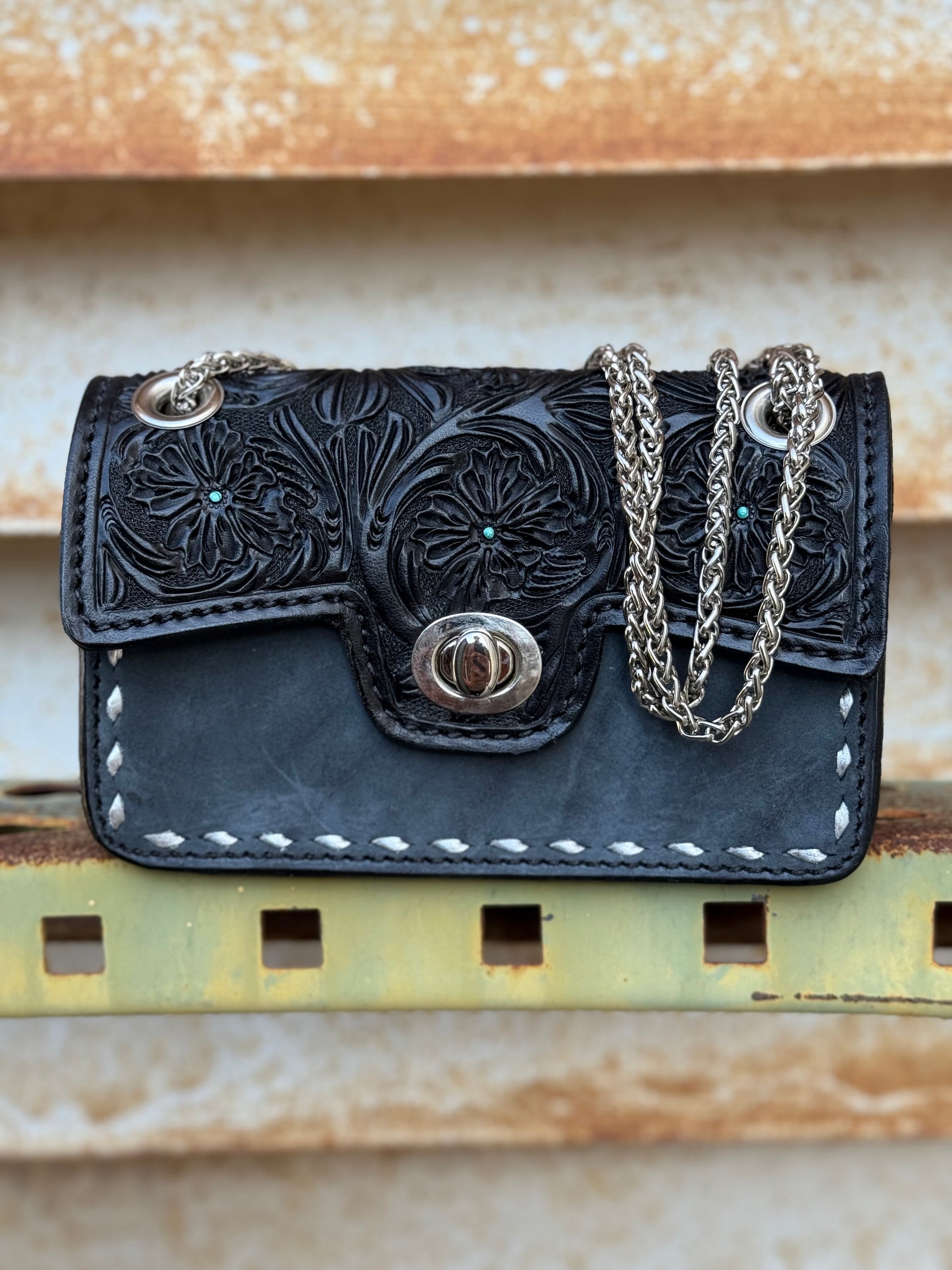 Handbag mixes of toast roughout and golden leather with hand floral tooling. It has an adjustable designer chain. You have the option to have a short chain or long chain when wearing this. These are NFR APPROVED! With its clear material on the sides and the bottom of this clutch!