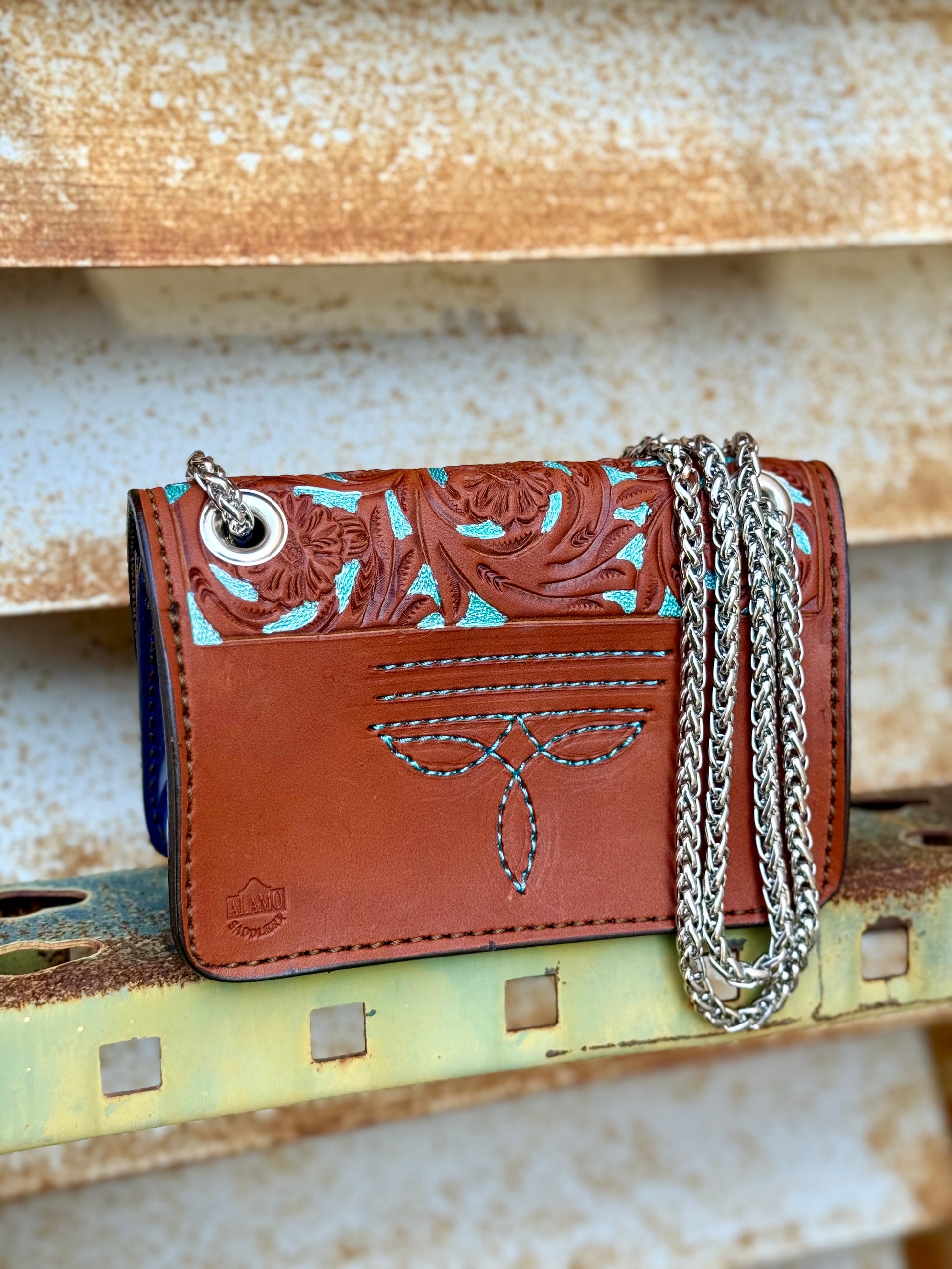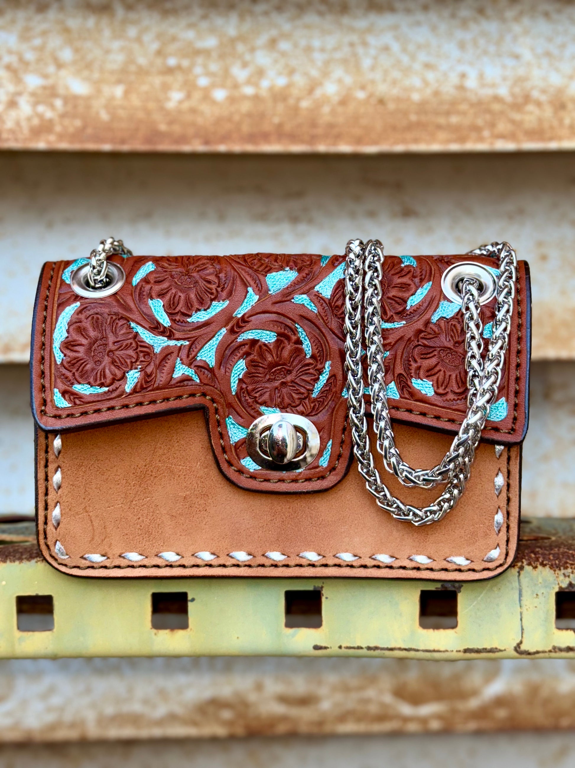 Handbag  with gorgeous hand floral tooling . It has an adjustable designer chain. You have the option to have a short chain or long chain when wearing this. These are NFR & STADIUM APPROVED! With its clear material on the sides and the bottom of this clutch!