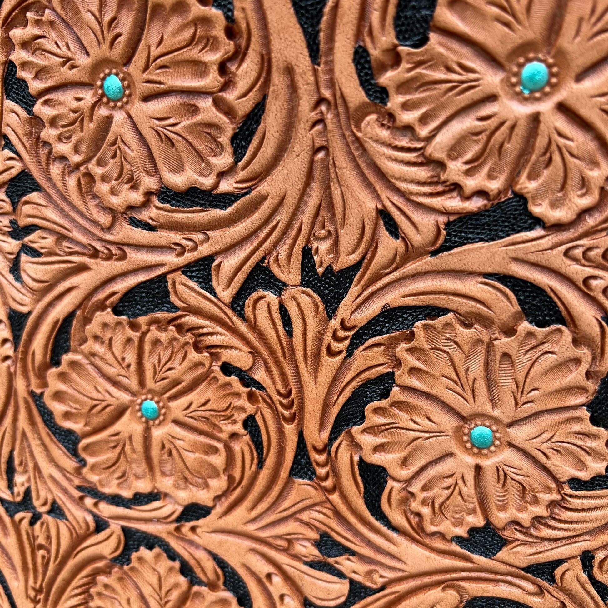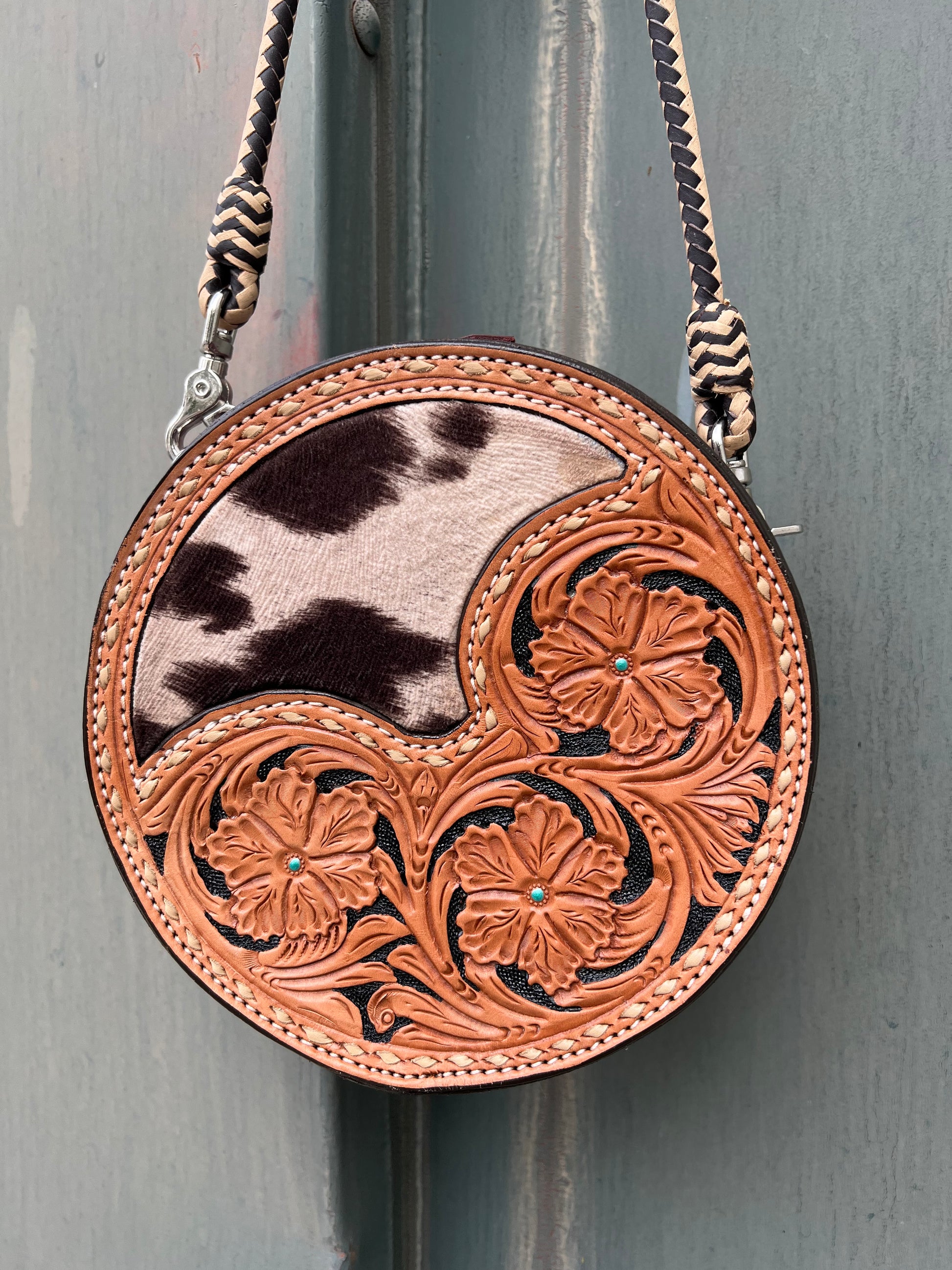 El Pinto canteen handbag is available our 8" round purse. Comes in golden leather, with gorgeous hand floral tooling, detailed with shimmer turquoise paint in the center of each floral with black background paint, there is a chocolate and white cow suede print inlay and this is outlined with cream buck-stitch, comes with two toned braided strap that is removeable (if desired) (28in long)