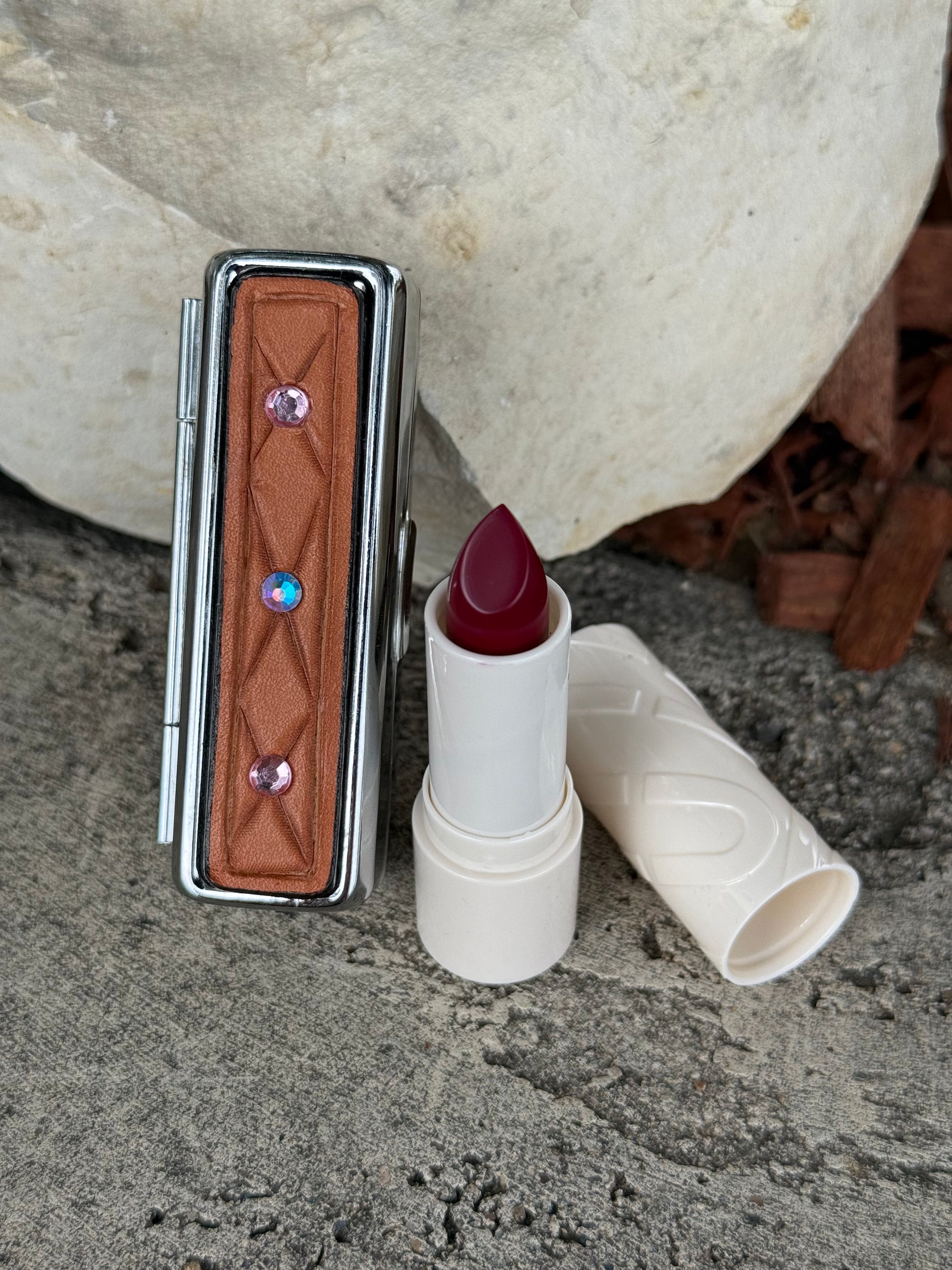 Gorgeous leather covered lip stick cases, with a mirror on the inside as well, keep your favorite lip stick with you, fits basic lipstick cases, embellished with real crystals.