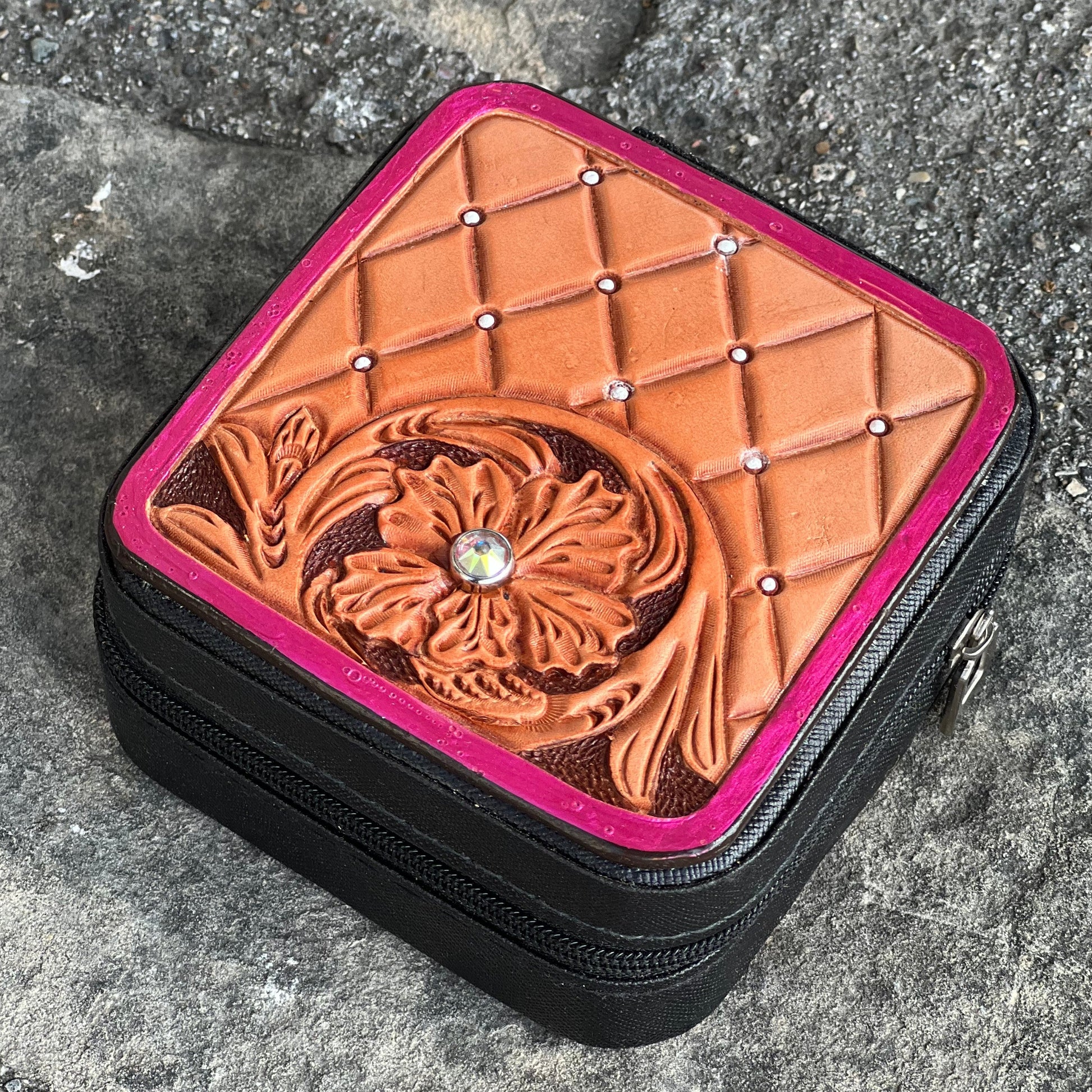Mini travel jewelry box with hand cut, hand tooled leather work.