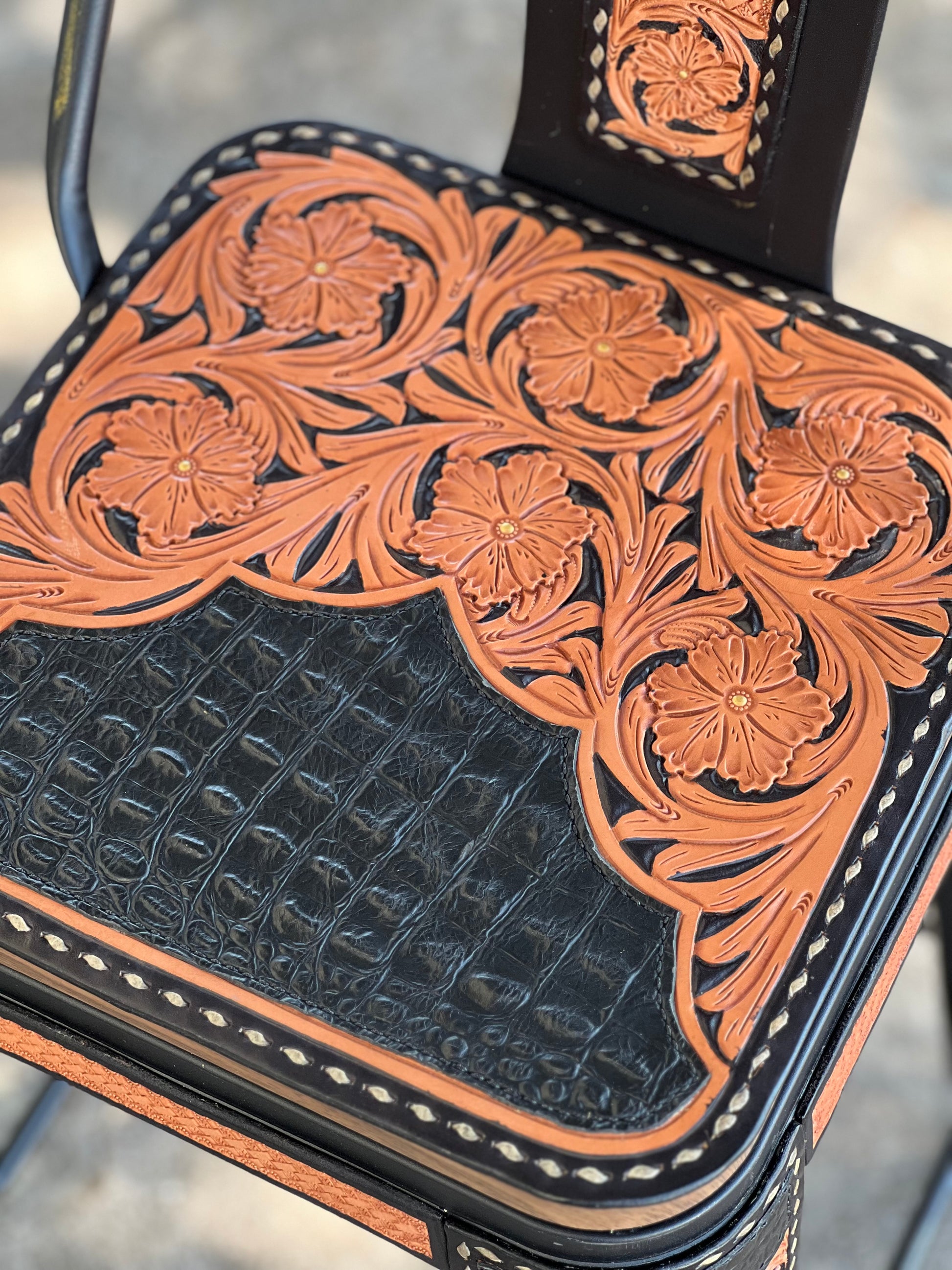 Set of 2 (or 3-4) metal swivel bar stools with black gator overlay (print) with floral hand tooled leather with paint and buckstitch.