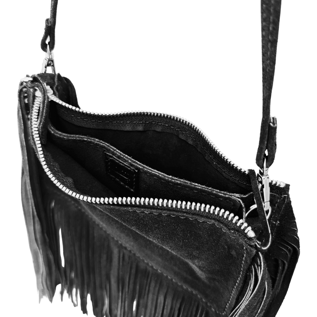 The Raglet Handbag is a 100% handmade suede purse that’s timeless, versatile, and functional. Made for everyday wear, this bag features hand-cut fringe on both sides and along the bottom, giving it a western boho style that stands out.