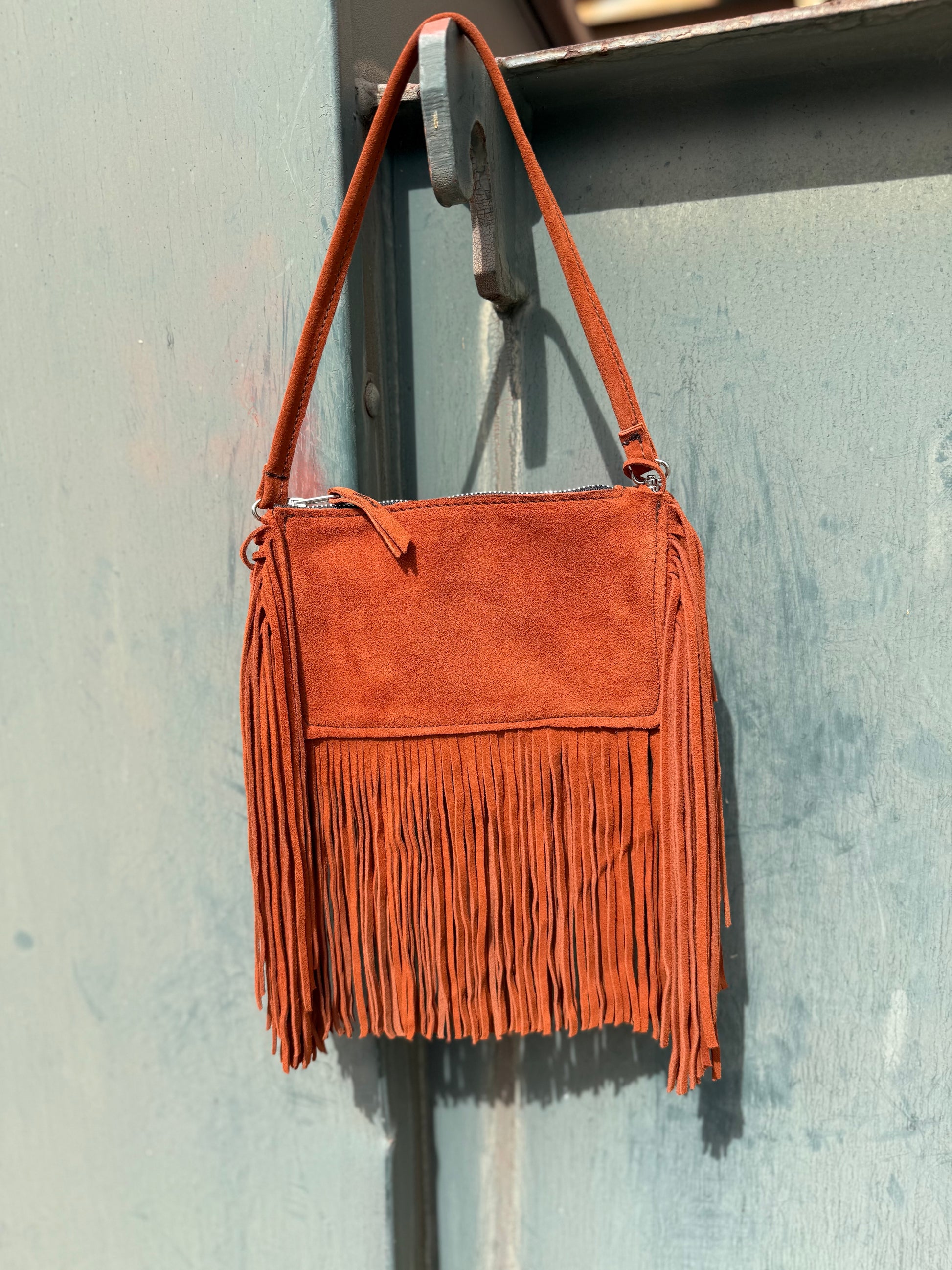 The Raglet Handbag is a 100% handmade suede purse that’s timeless, versatile, and functional. Made for everyday wear, this bag features hand-cut fringe on both sides and along the bottom, giving it a western boho style that stands out.