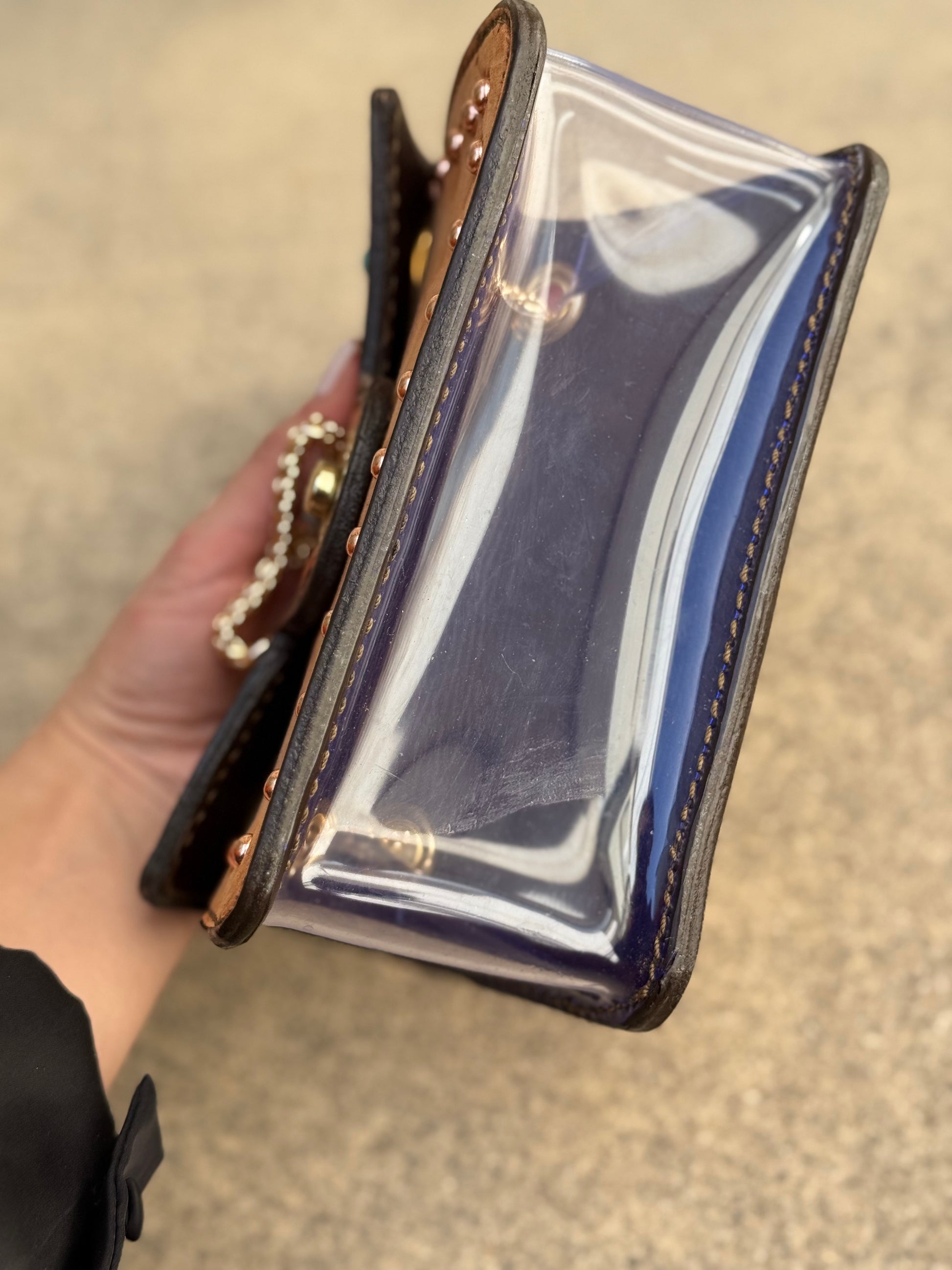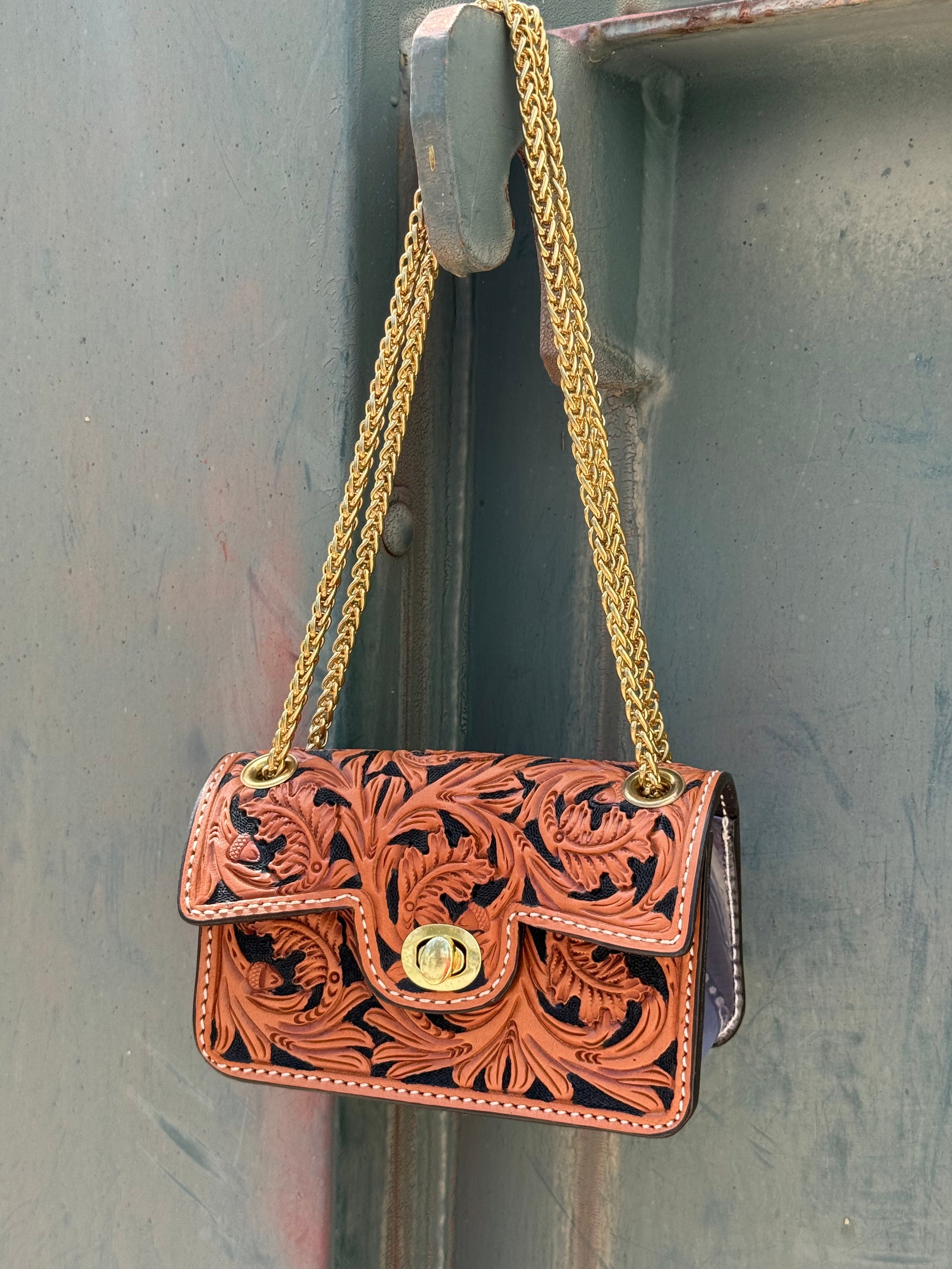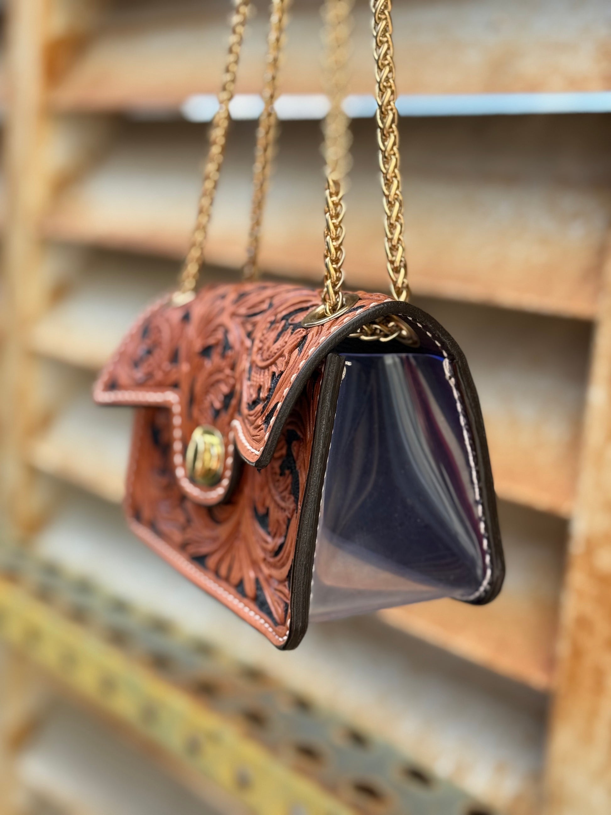 The Cowgirl clutch is NOW A MUST HAVE! With its high end design and clear underside, this stadium bag option elevate your look. Done on golden leather with full hand tooled oakleaf tooling with a black painted background, the back is clean with hand-stitch pipe work, with the famous boot stitch design. Its underside is done on thick, high-end PVC material, making this CLEAR, and STADIUM APPROVED. Finished with gold hardware and a weighted designer chain that is 47" long and can double as a shoulder bag or clutch.