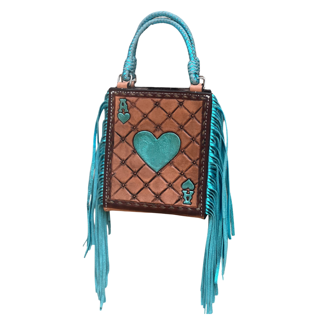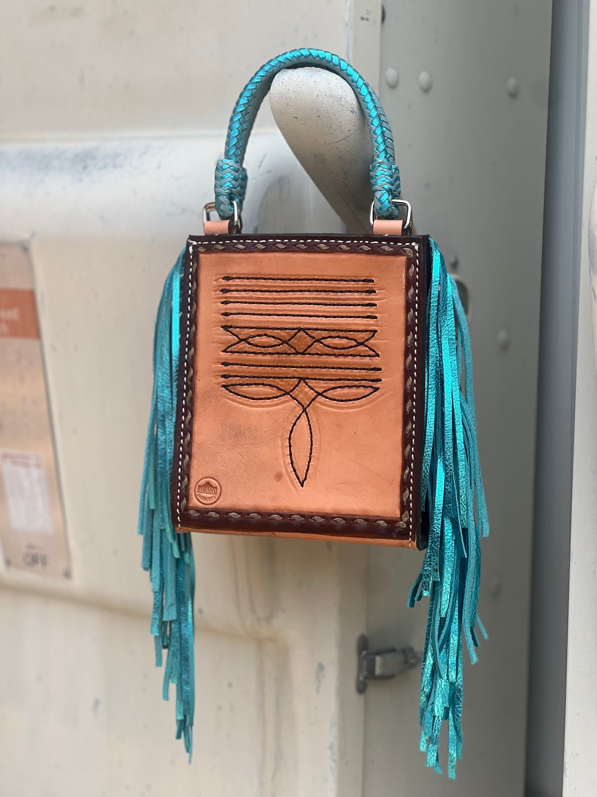 The Card handbag was created for the perfect day/day out! Hand braided handle (some with fun metallic suede fringe) with leather hand tooled bag. 7.5" tall 6in long and 2.25" wide. Hold all the essentials you need for the day or night. Comes with d-rings inside to place a strap if you would like